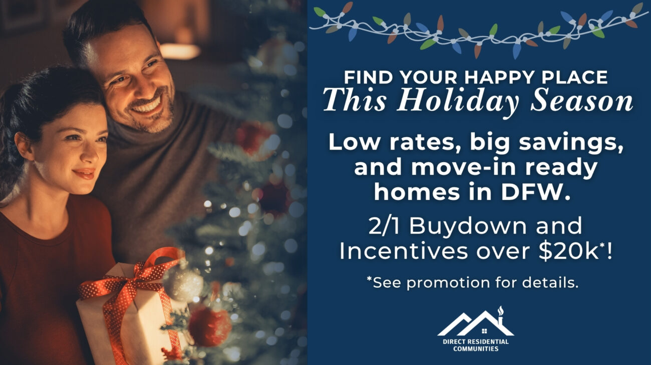 Find your happy place this holiday season in one of these new DFW communities! From cozy evenings by the fireplace to fun-filled weekends exploring the neighborhood, your dream home is ready—and you could move in just in time to celebrate the holidays.
